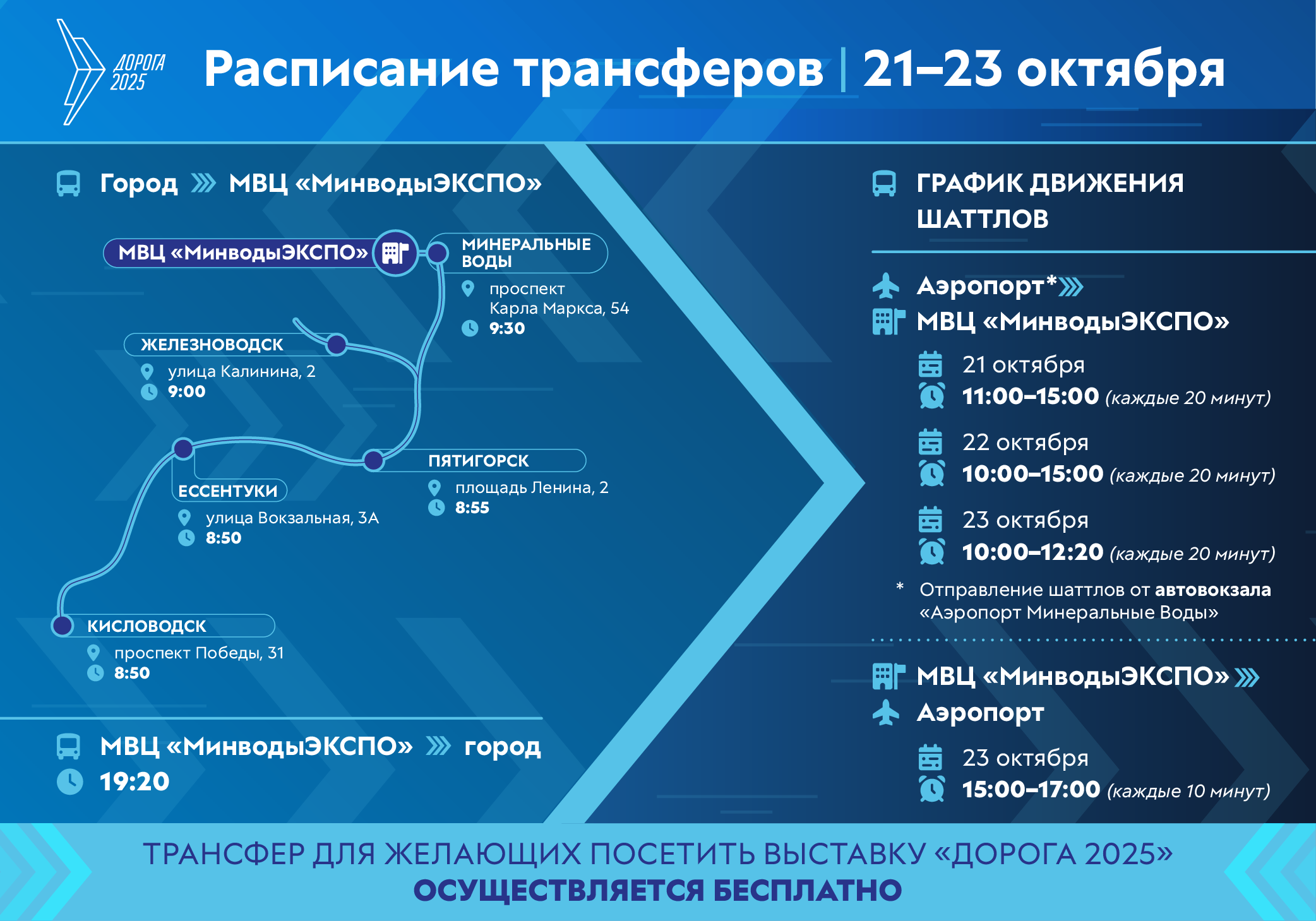Отправление трансфера в обратном направлении с территории МВЦ «МинводыЭкспо» в указанные города запланировано ежедневно с 21 по 23 октября 2025 года в 19.20.